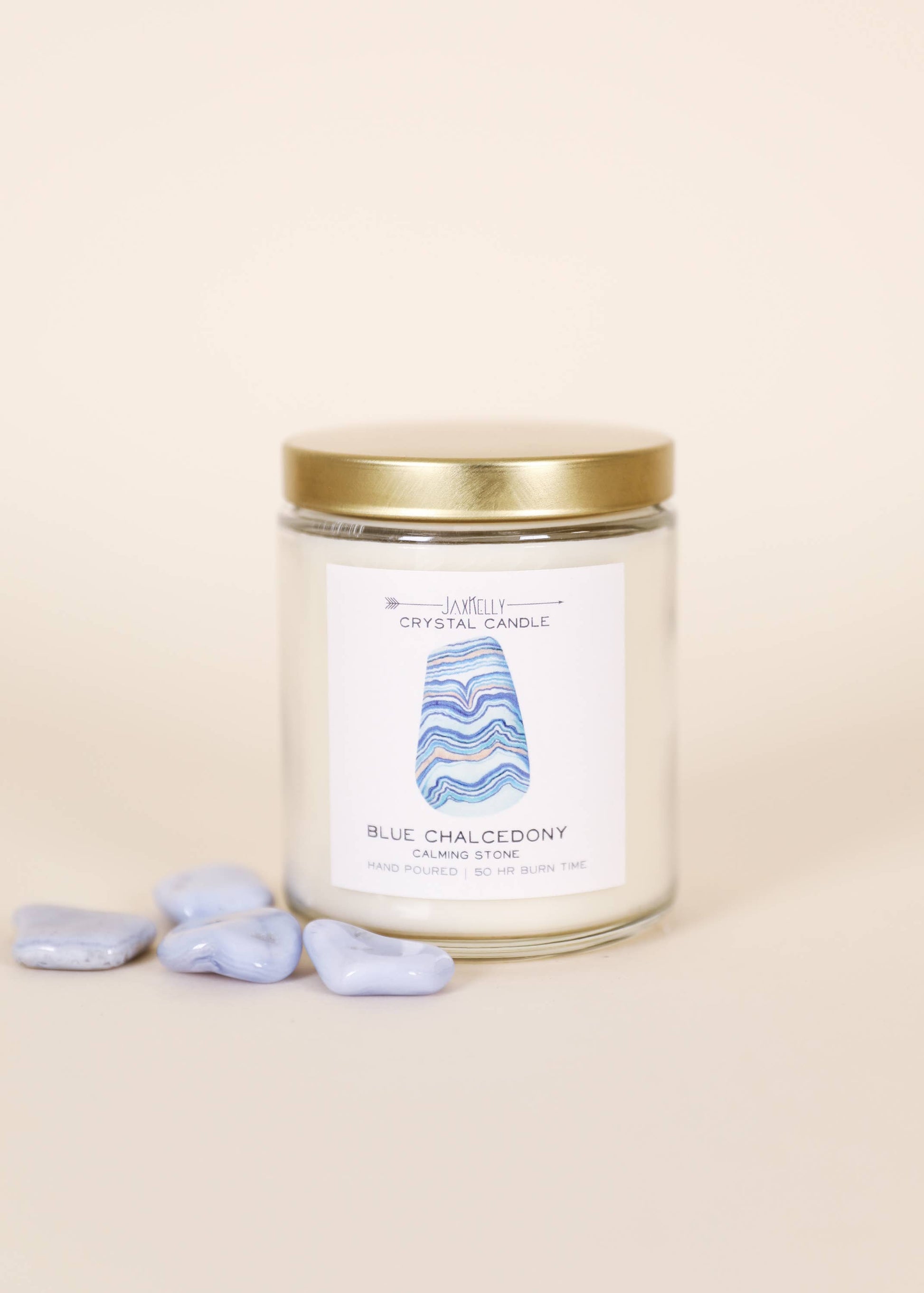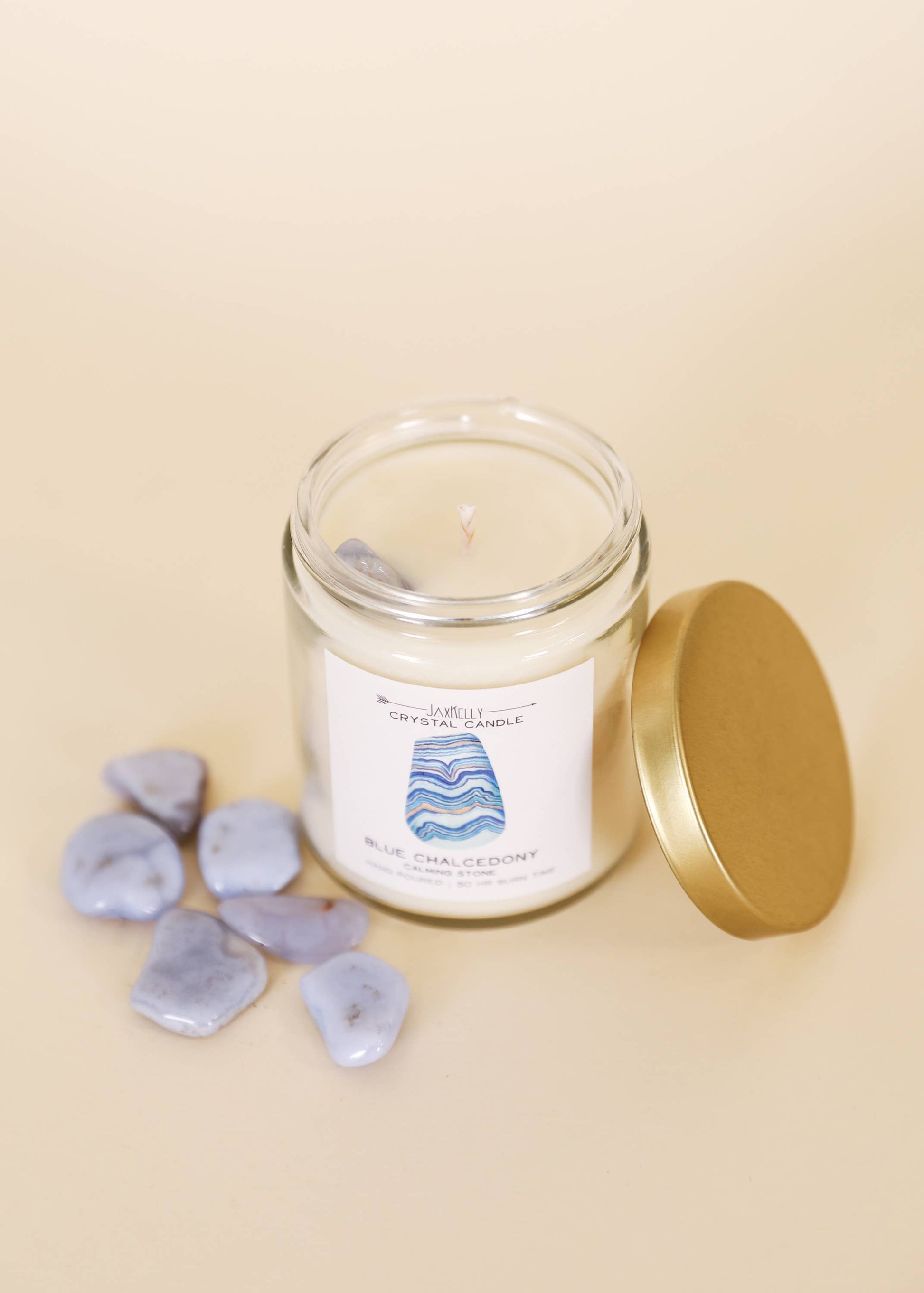 Nestled on top is a Blue Chalcedony that radiates calming energy. Once your candle has burned, retrieve your tumbled stone and carry it with you, or place it in a special space to manifest feelings of serenity.
