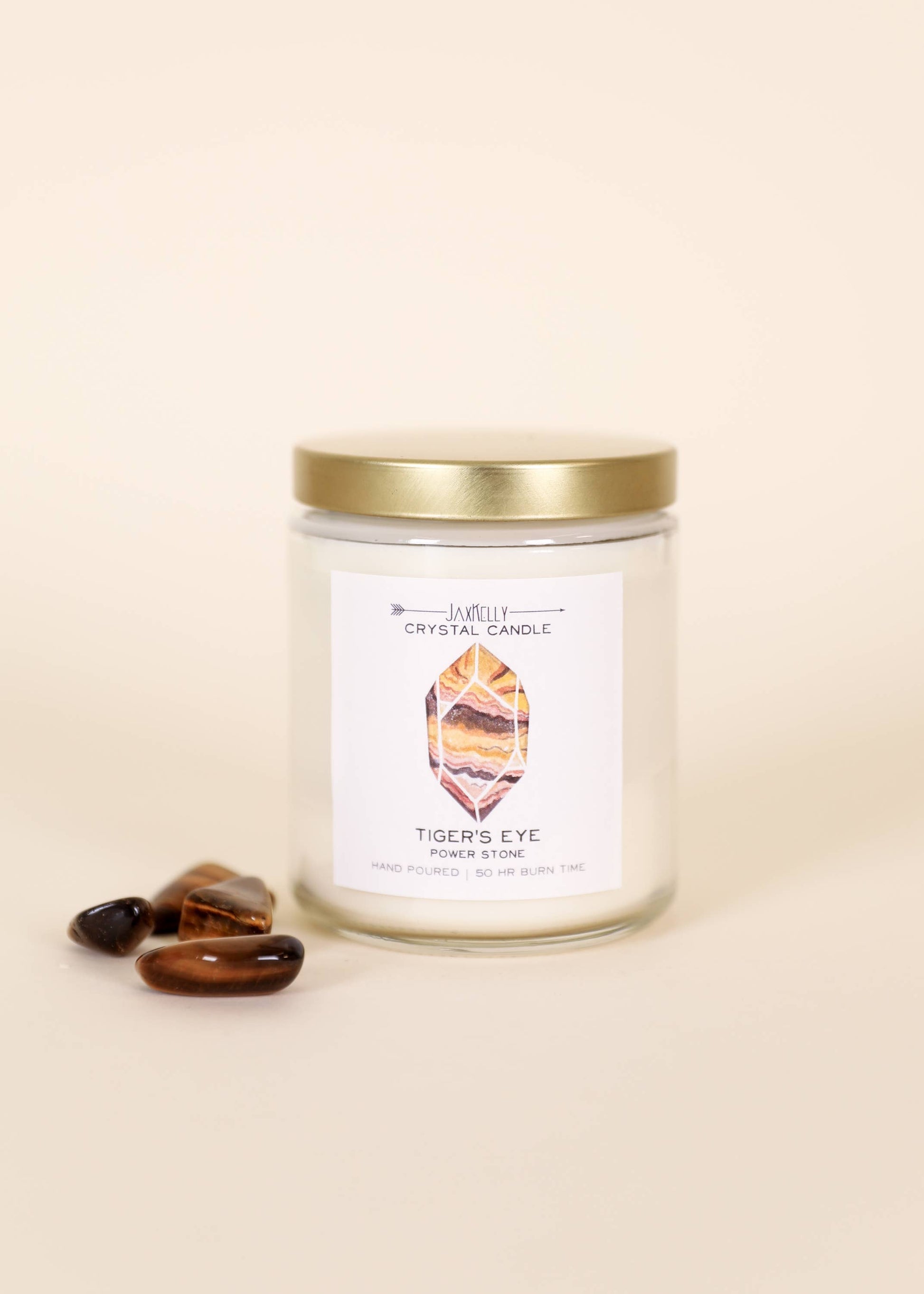 Nestled on top is a Tigers Eye radiates powerful vibes to release fear and anxiety . Once your candle has burned, retrieve your crystal and carry it with you, or place it in a special space to empower your self-confidence.