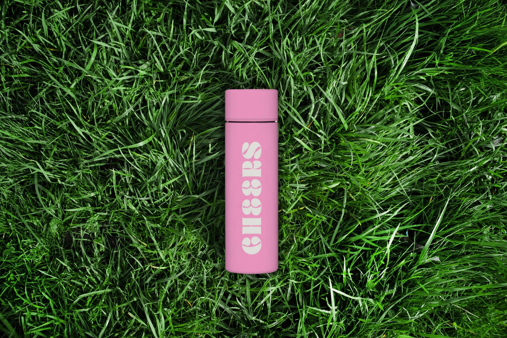This cute pink mini flask has the word "Cheers" and the slim cylinder design makes this bottle the perfect grab-and-go size for your favorite liquors. Stainless steel with pink exterior and white lettering.