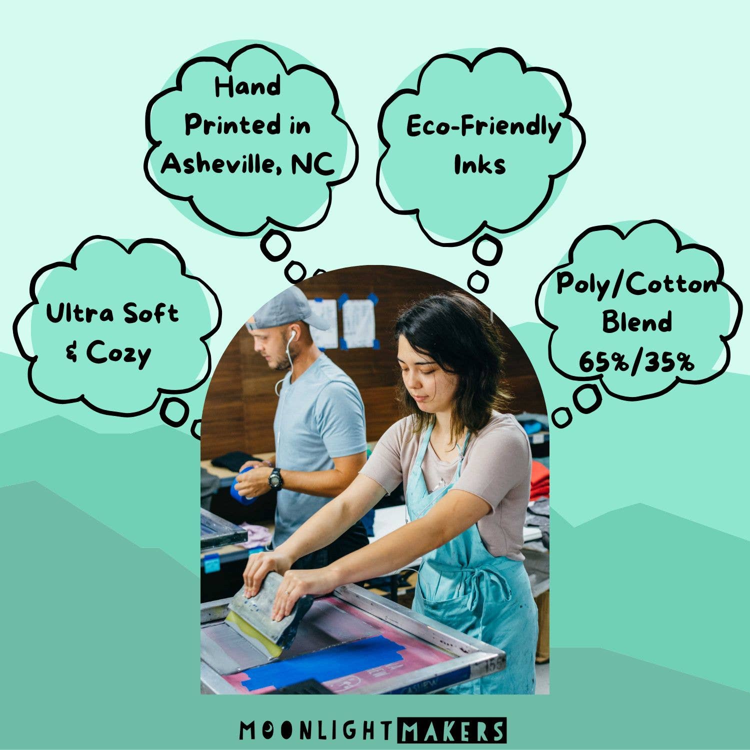 This is a Moonlight Makers original, designed and screen-printed by artists in Asheville, NC.