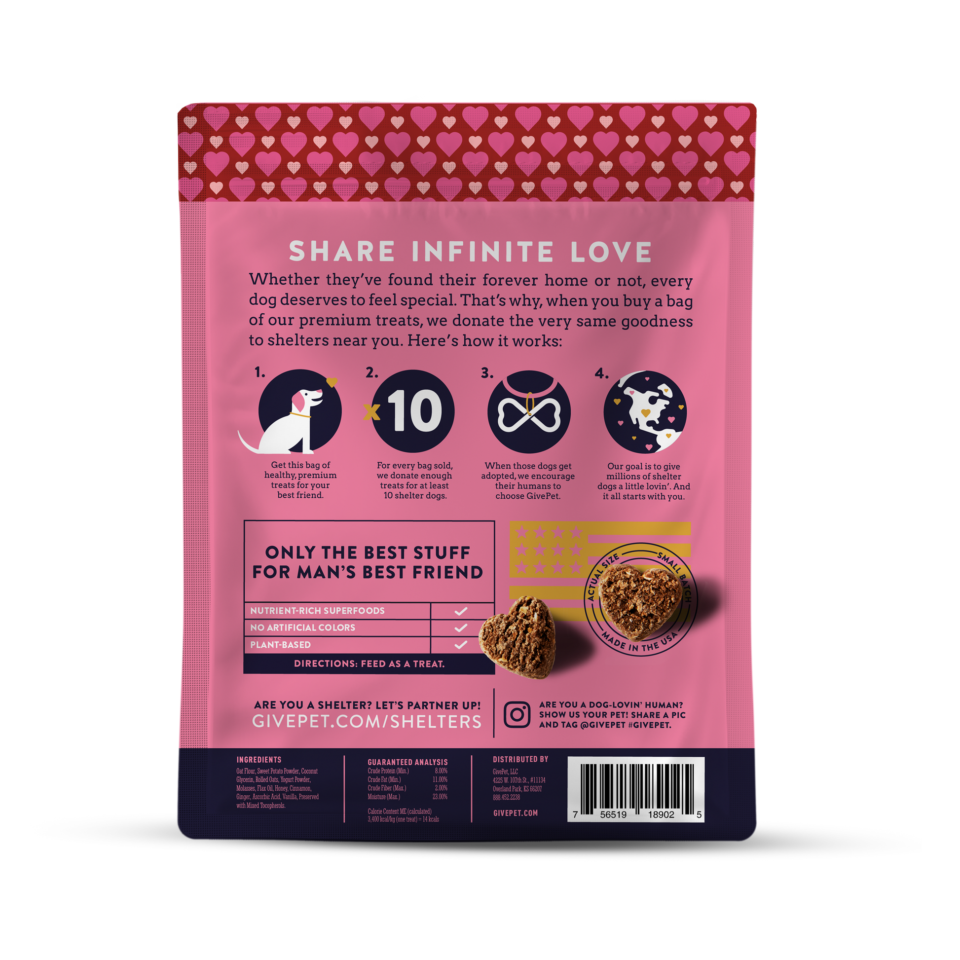 6oz bag of soft-baked dog treats. Made with nutrient-rich whole foods and superfoods. Yogurt, honey and cinnamon flavor. Perfect for a Valentine’s gift but is available year-round. Pairs perfectly with Sugar!