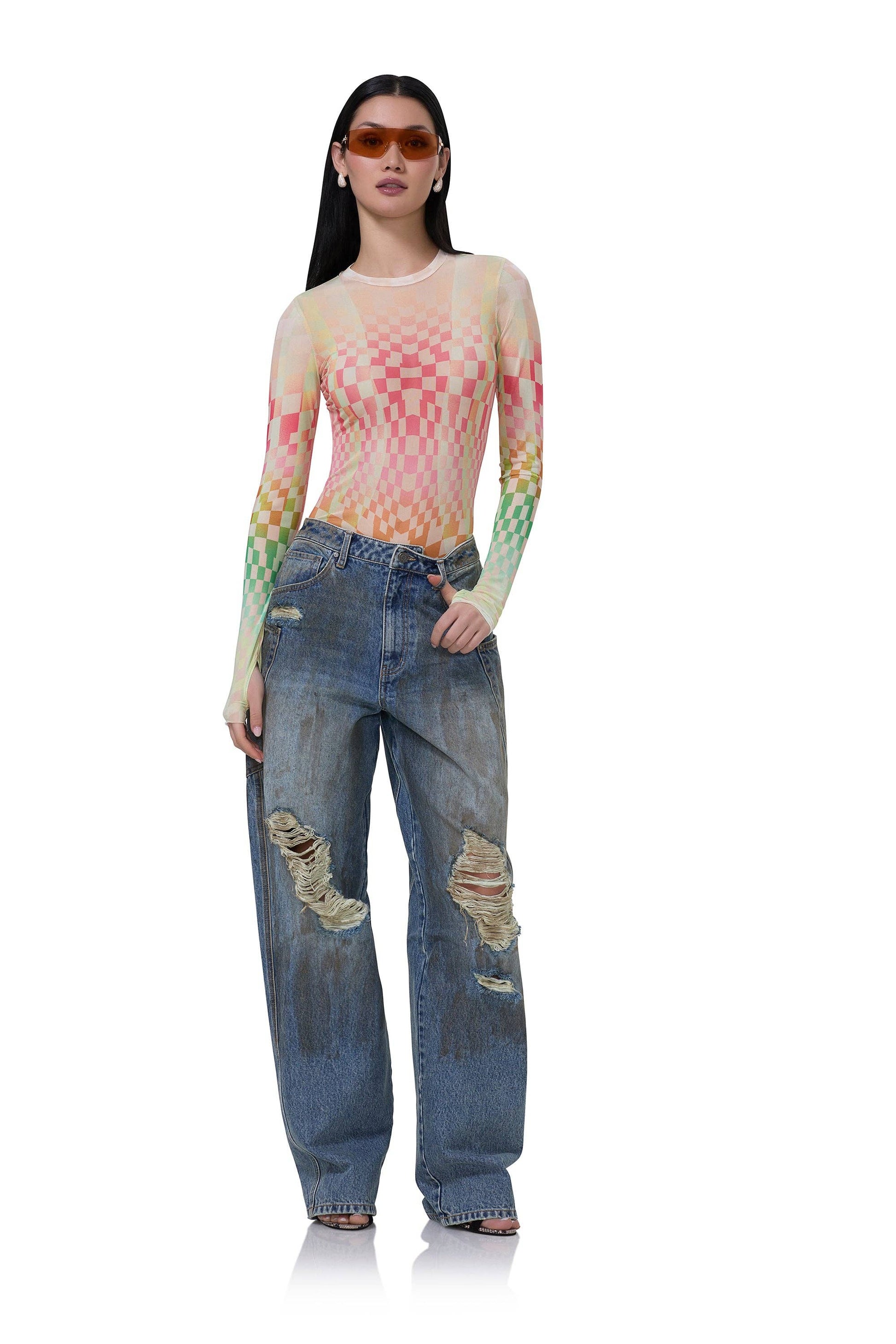 The Kaylee top features a sheer mesh material, crew neck and street-style thumbholes that lend an edgy update to off-duty style. She comes in Pastel Ombre.