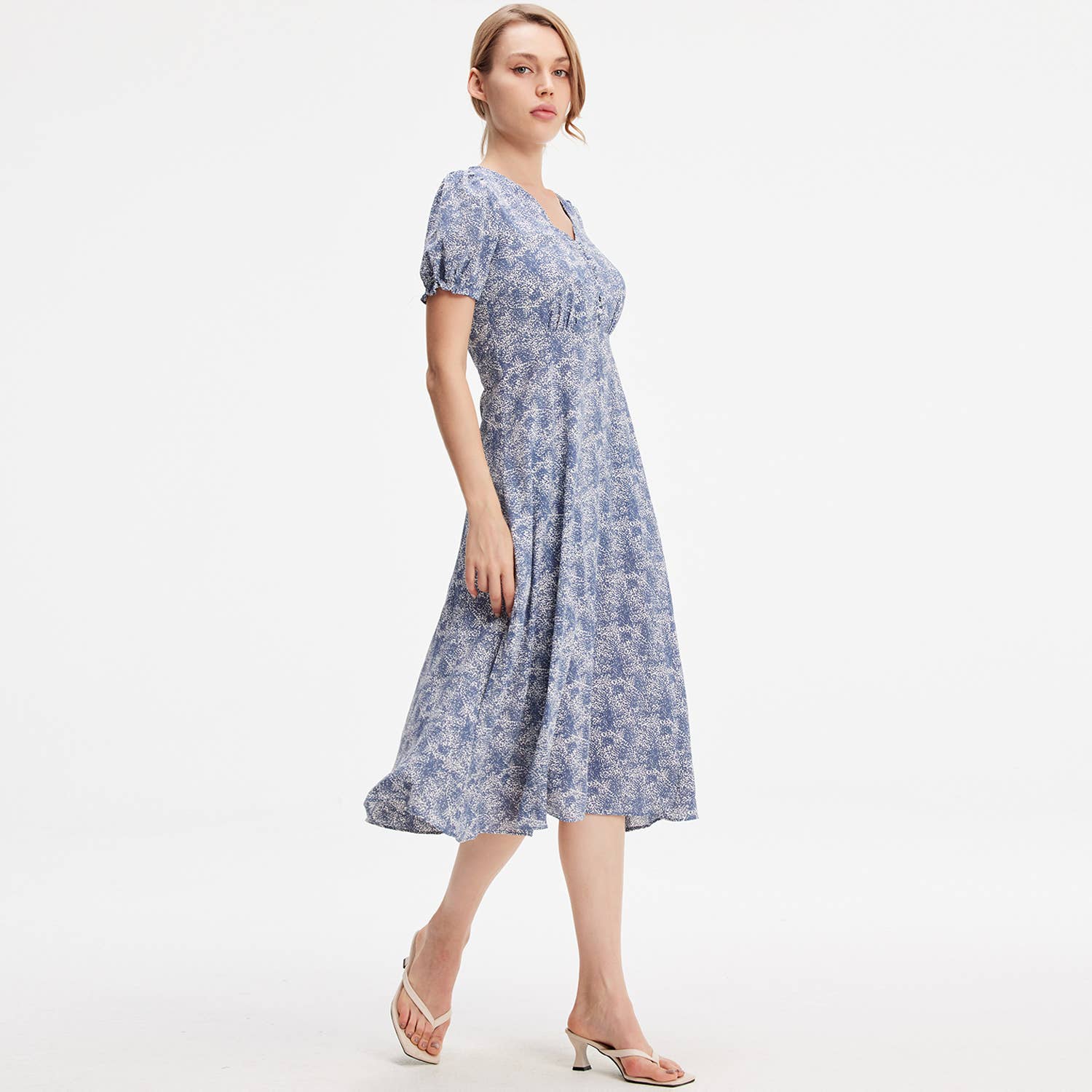 A light-colored mid-length dress with a discreet and subtle floral pattern tone-on-tone. Embellished with short, slightly puffed sleeves and a V-neckline decorated with buttons. An empire style line, cinched under the chest and generously flared. A light and refined piece, ideal for semi-formal occasions in spring such as weddings or garden parties. Easy to iron