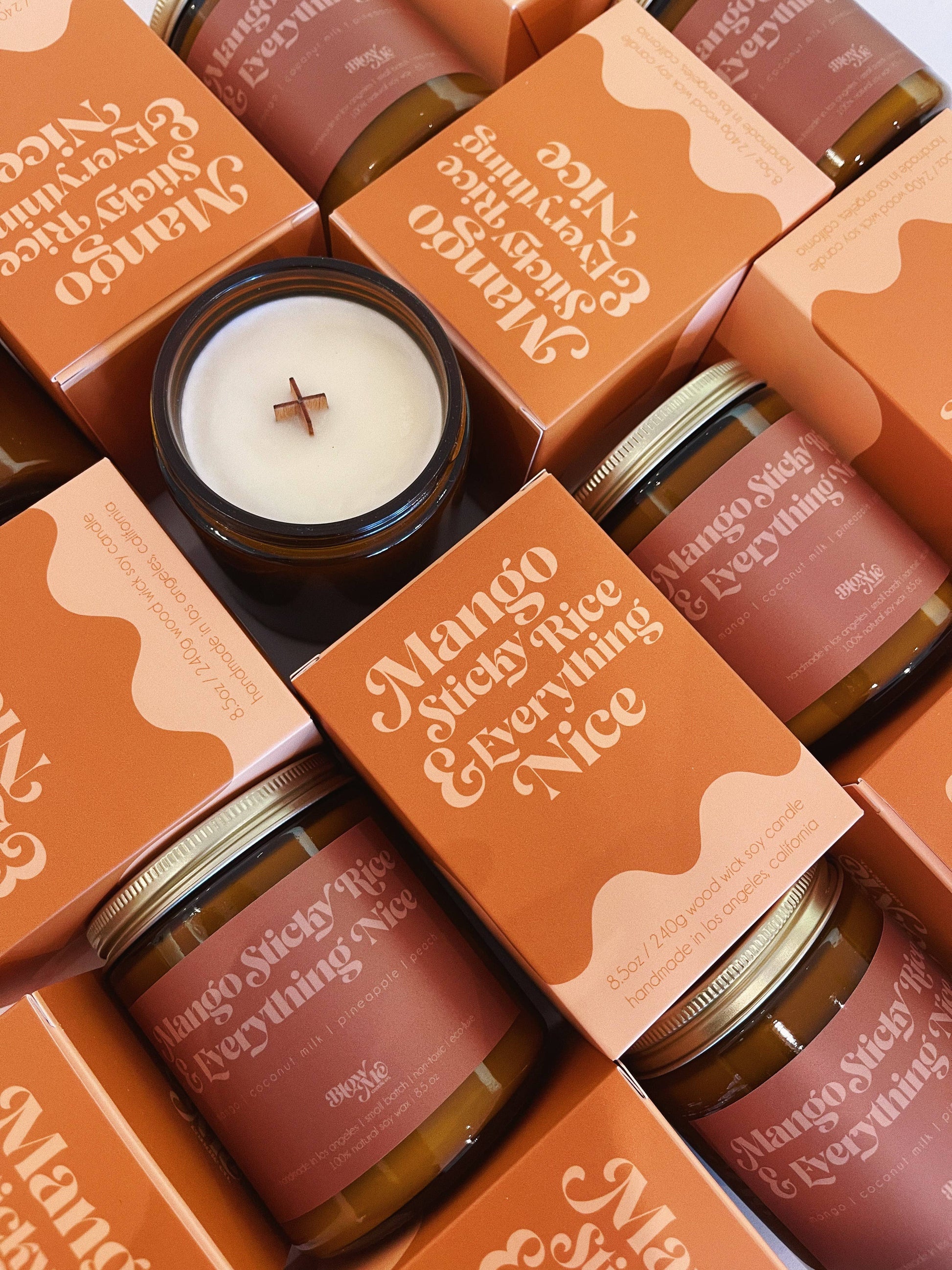 8.5oz all natural soy candle with a wood wick. Approximately 50+ hours of burn time.