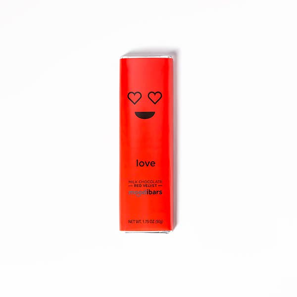 Moodibars® Love (1.75oz) - Milk Chocolate Red Velvet Bar. You might just fall in love after eating this chocolate bar... who needs a romance - chocolate will never break your heart! Heat sensitive! Store in cold dry area out of sunlight.